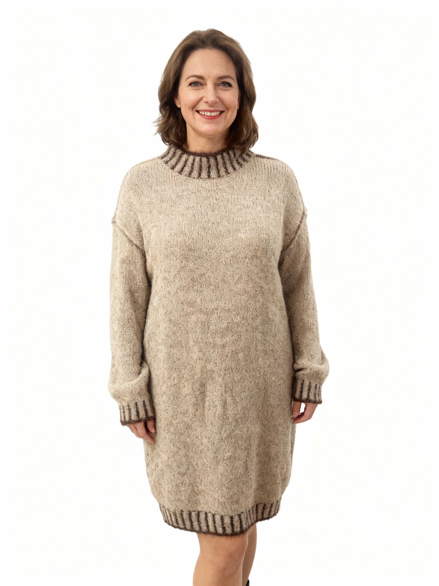 The soft fawn tone is elevated with brown accent stripes at the cuffs and neckline, adding subtle contrast and a refined finish. Featuring a high, comfortable neckline, this knit dress offers warmth without feeling restrictive, making it ideal for cooler days when style and comfort matter equally.
