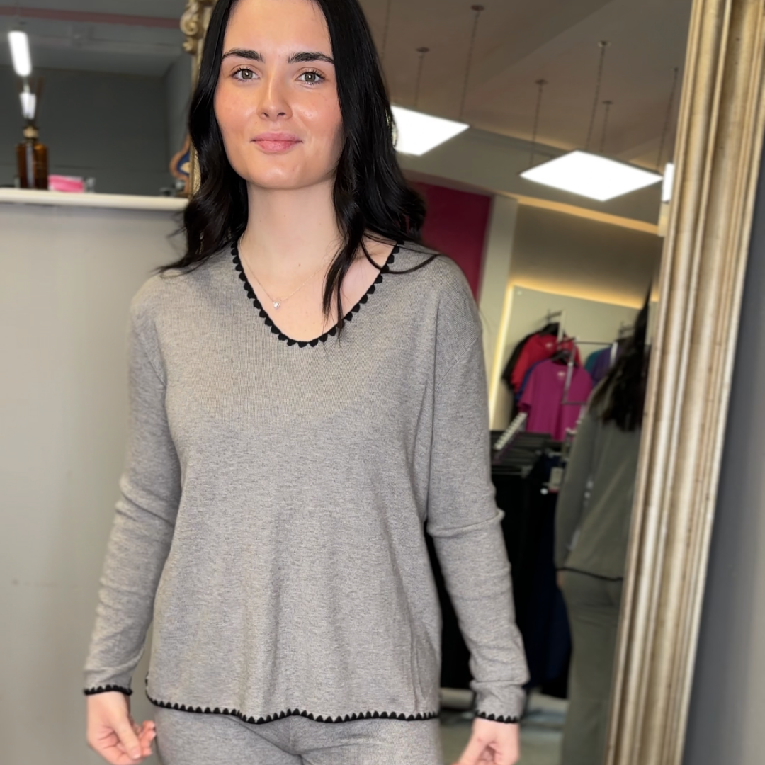 Chic, comfy and easy to wear, ourgrey Co-Ord with black Scallop Edge is the perfect throw on and go set. Featuring a long-sleeved top and matching trousers, the soft grey fabric is finished with black scallop trim for a gorgeous contrast detail. Dress it up or keep it casual, it’s an effortless look you’ll reach for again and again.