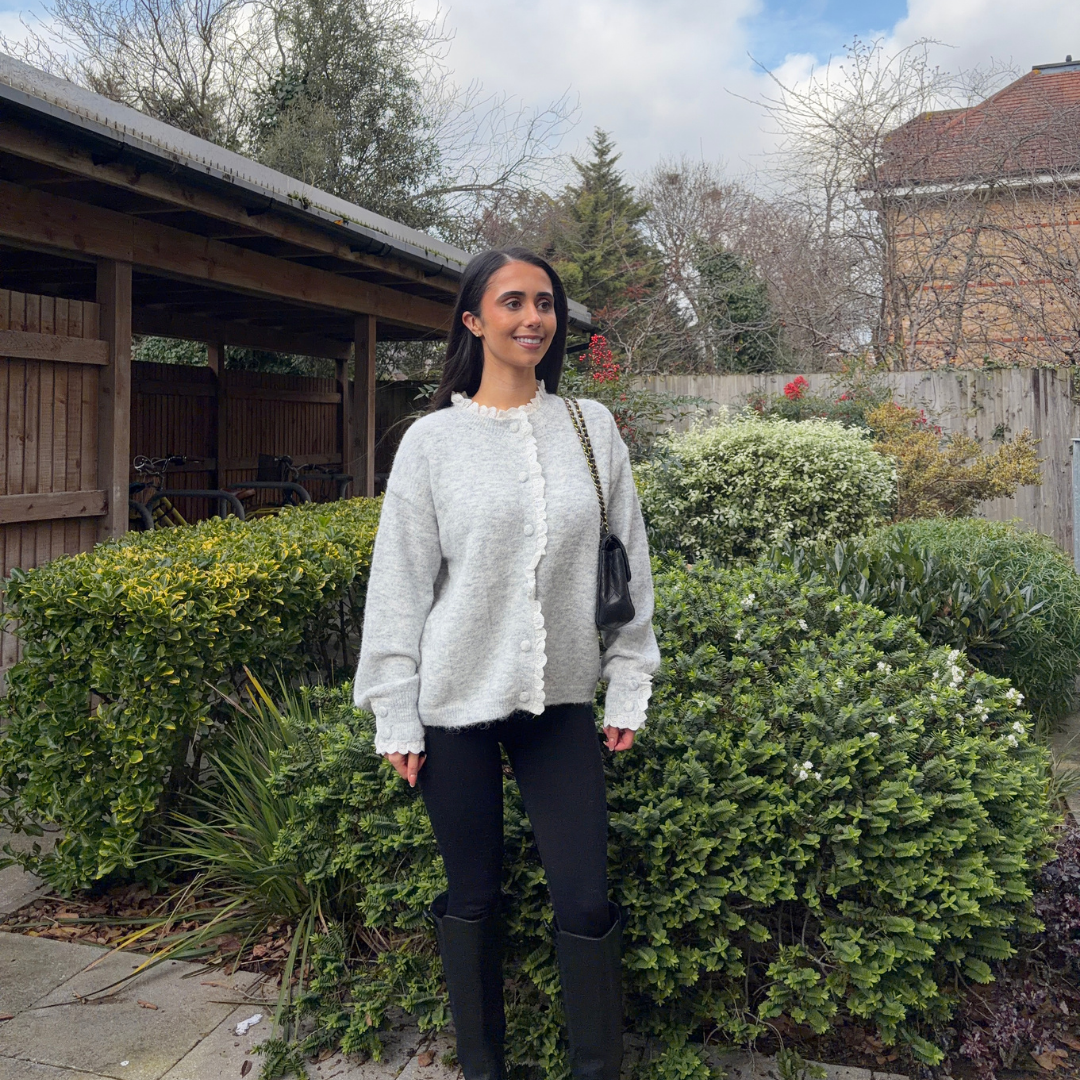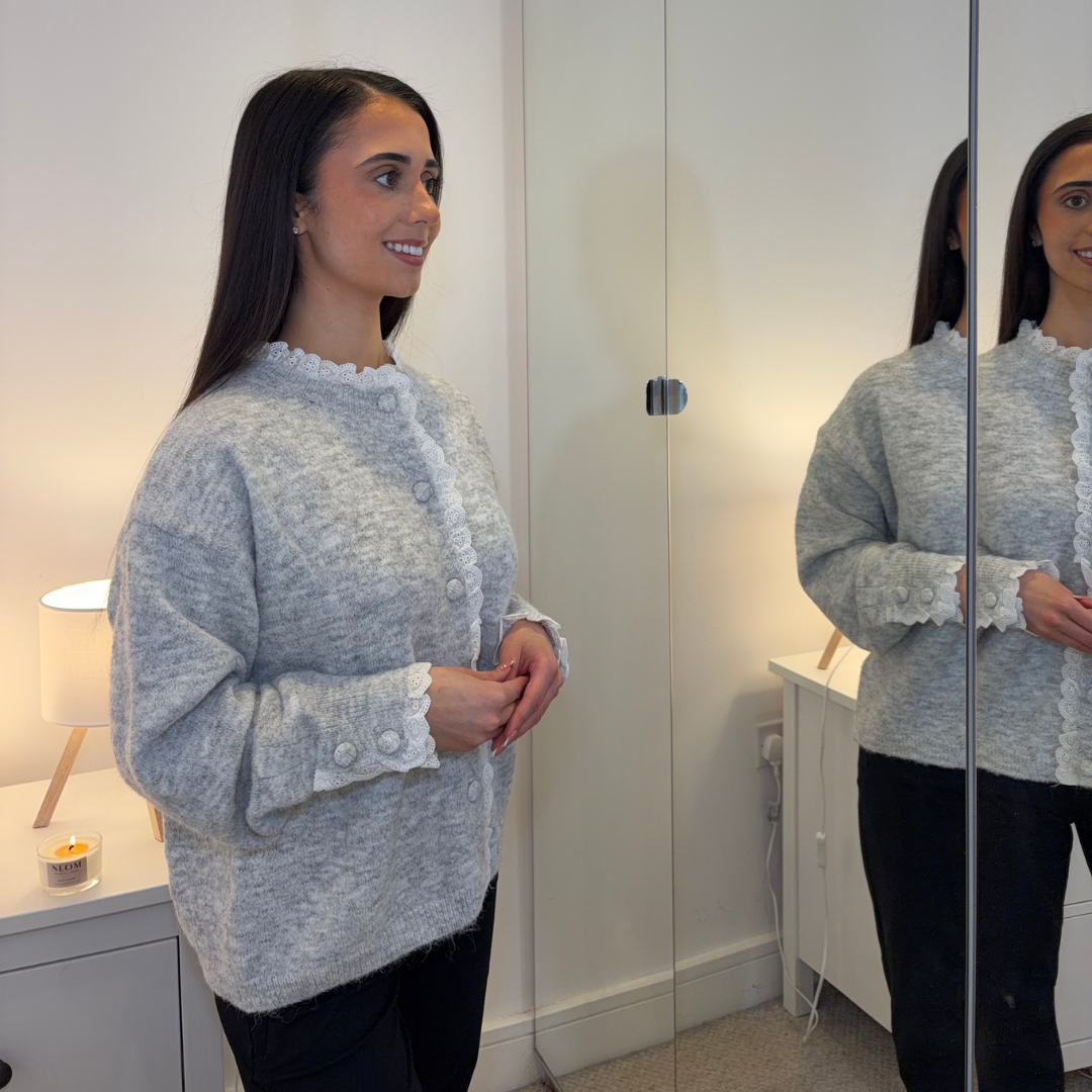 Soft, feminine and effortlessly elegant, our Grey & White Frill Detail Cardigan is the perfect blend of comfort and timeless style. Designed in a relaxed one size fits all fit, the soft grey knit is beautifully complemented by delicate white frill detailing that adds a subtle, stylish finish. Lightweight yet cosy, it’s perfect for layering throughout the seasons and pairs effortlessly with jeans, leggings or Slim or Straight Leg Pants.
